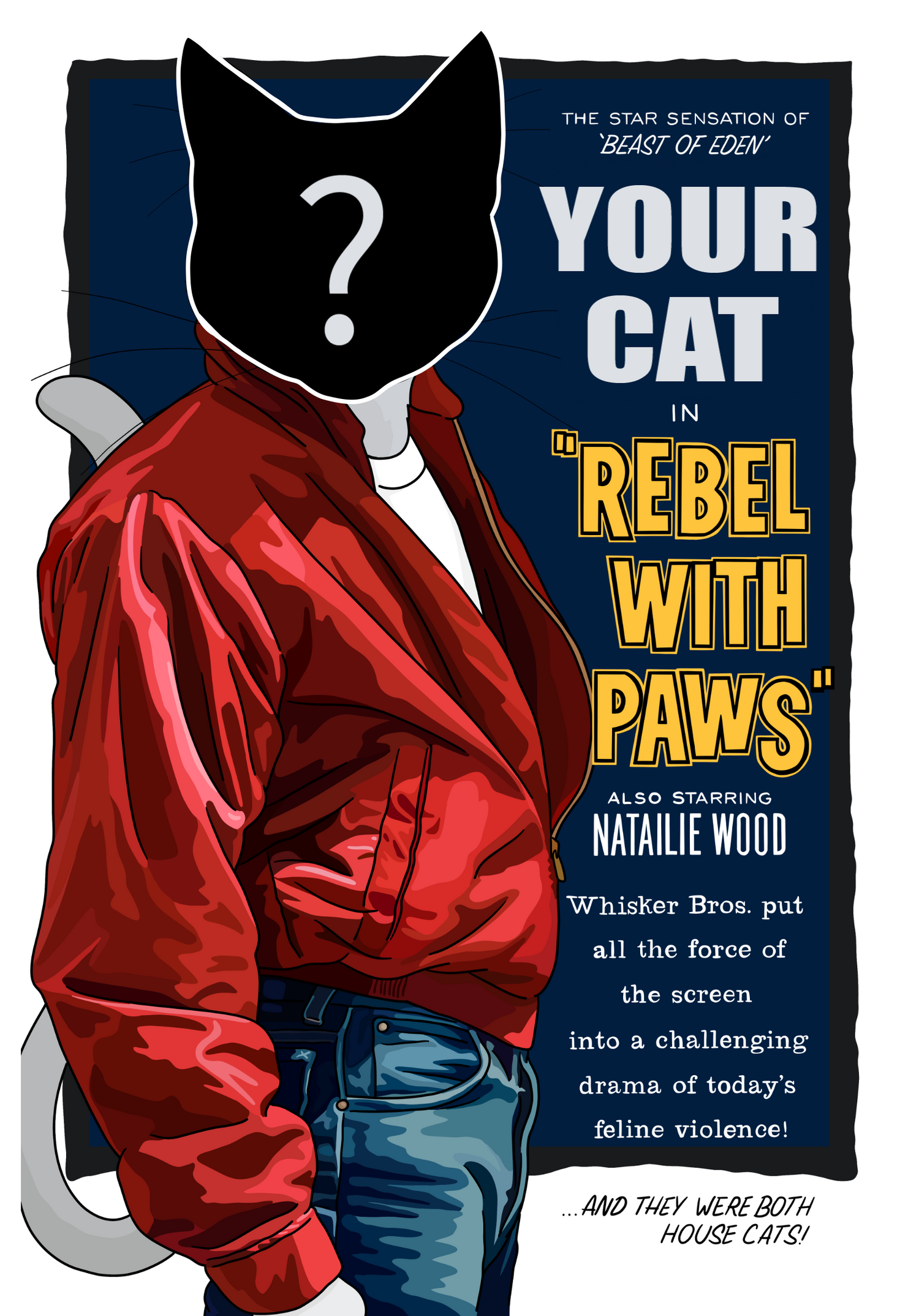 If you love one of my existing posters and want your cat as the star, I can do that! It's much easier to switch out a cat face and change an actor name than it is to draw a whole poster from scratch. This is my least expensive option. Depending on the poster in question, it will usually be $75 per cat to "recast" the actors. Reach out to me with the specific poster and how many recasts and we can finalize a plan.
