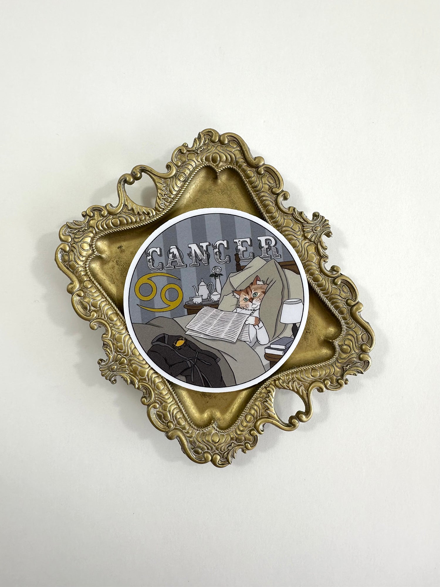 High-quality matte, vinyl, dye-cut sticker, are suitable for indoors or outdoors (cat-pun intended). They are a great addition to a water bottle, car bumper, phone case, guitar case, or any other place stickers are stuck. This design is Cancer (June 21 - July 22) as an Edwardian cat in bed.