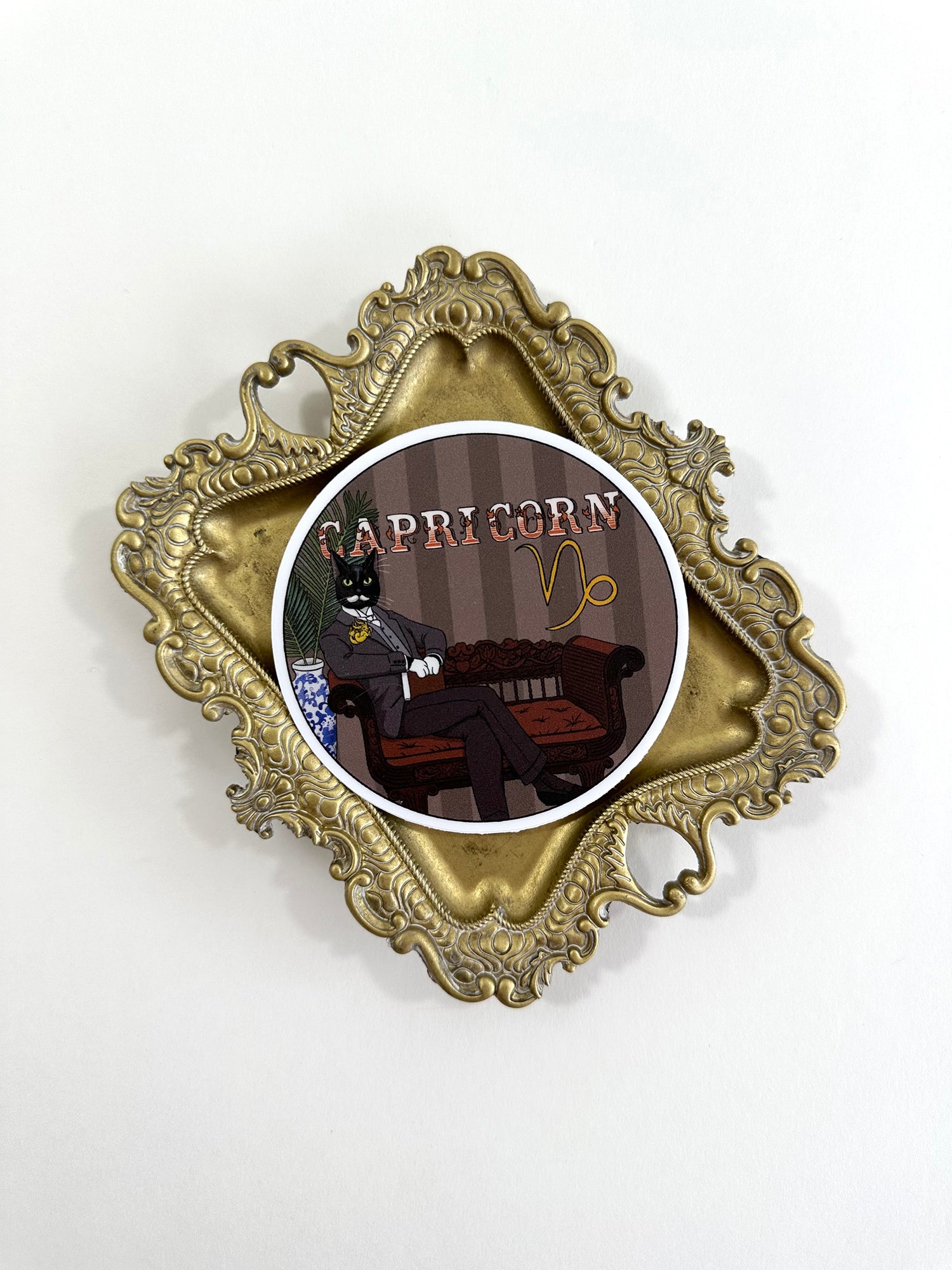 High-quality matte, vinyl, dye-cut sticker, are suitable for indoors or outdoors (cat-pun intended). They are a great addition to a water bottle, car bumper, phone case, guitar case, or any other place stickers are stuck. This design is Capricorn (December 22 - January 19) as an Edwardian gentleman cat.