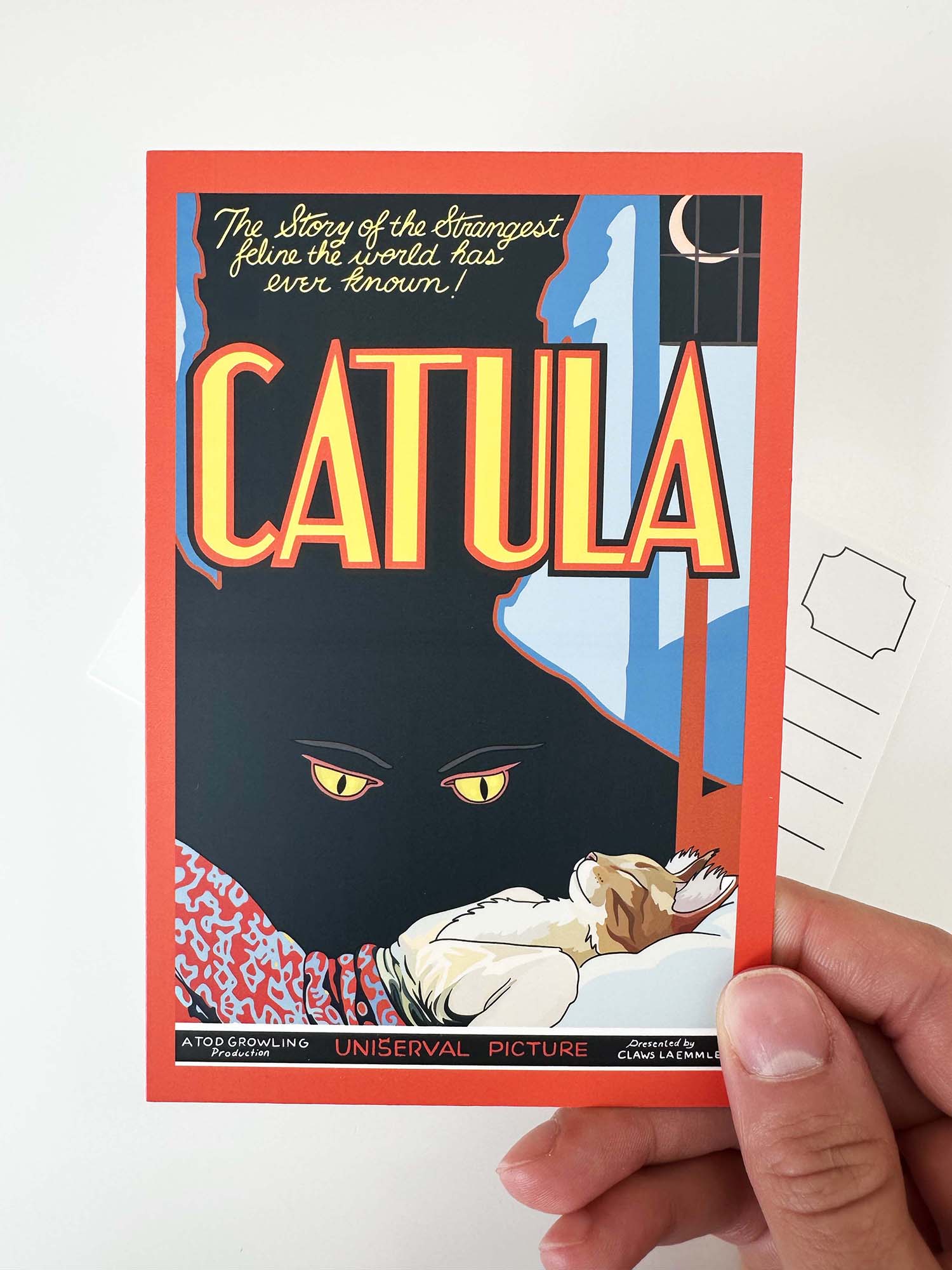 Design is "Catula" "The story of the strangest feline the world has ever known." This cat themed parody of "Dracula" is sure to delight any fan of cats and old movies. It has undergone catification, with every name a hilarious cat pun.