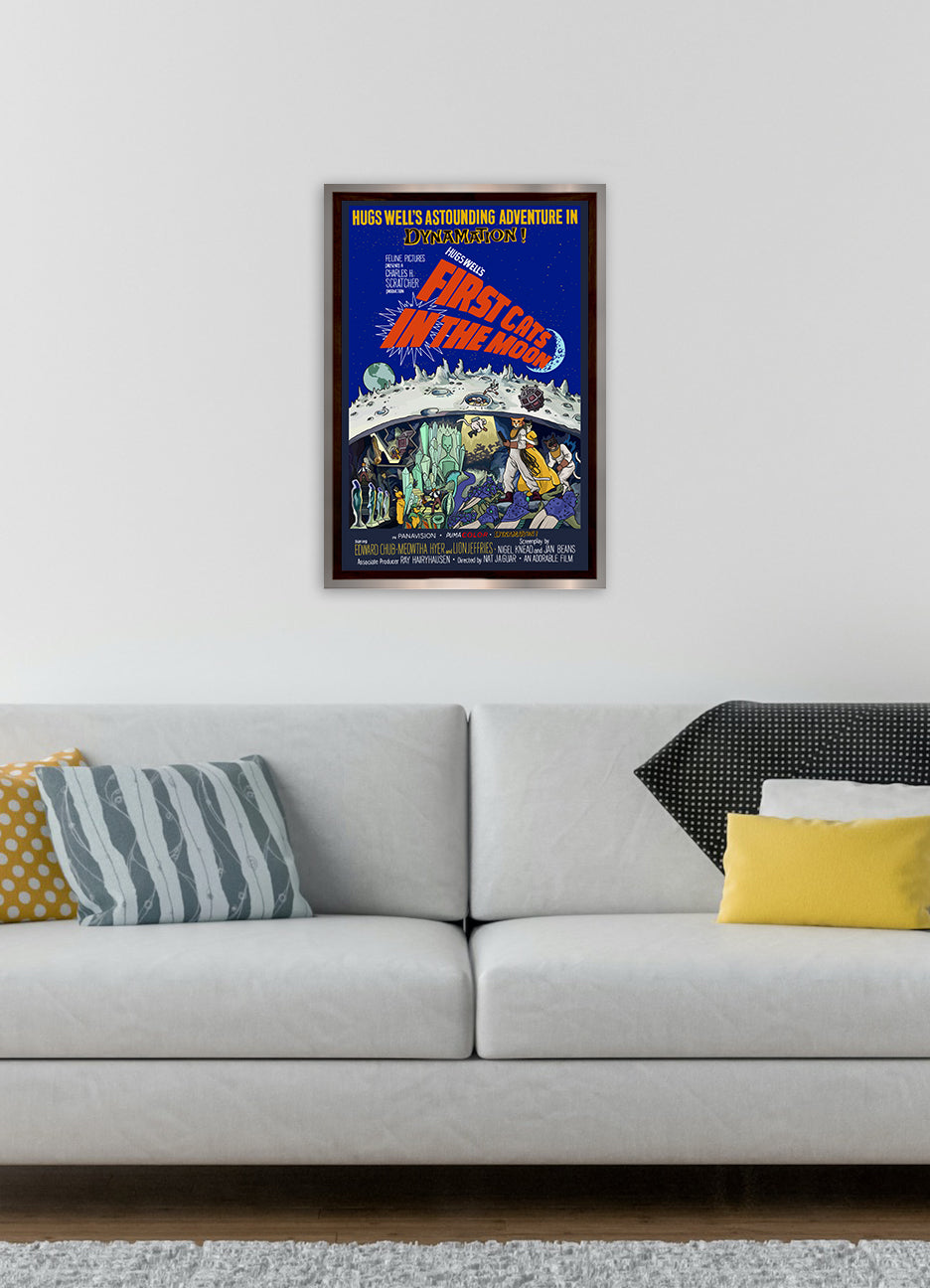 Design is "First Cats IN the Moon," starring Edward Chub, Meowtha Hyer, and Lion Jeffries. This cat themed parody of the sci-fi film "First Men IN the Moon" with Edward Judd is sure to delight any fan of cats and old movies. It has undergone catification, with every name a hilarious cat pun.