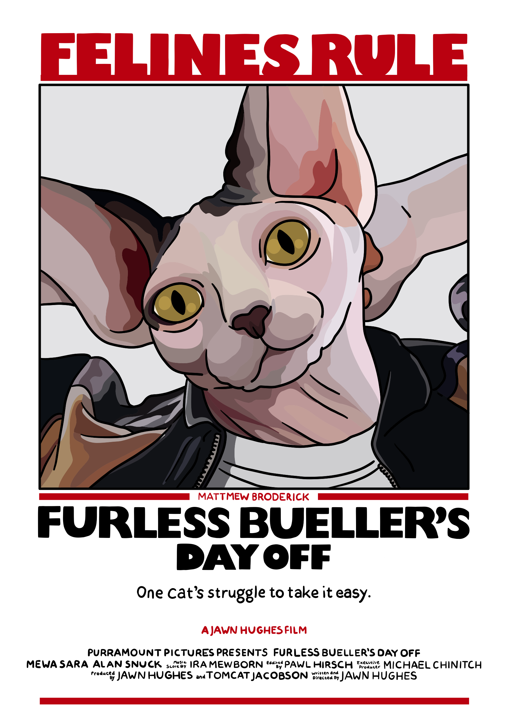 Design is "Furless Bueller's Day Off" with Mattmew Broderick. This cat themed parody of "Ferris Bueller's Day Off" is sure to delight any fan of cats and 80s movies. It has undergone catification, with every name a hilarious cat pun.