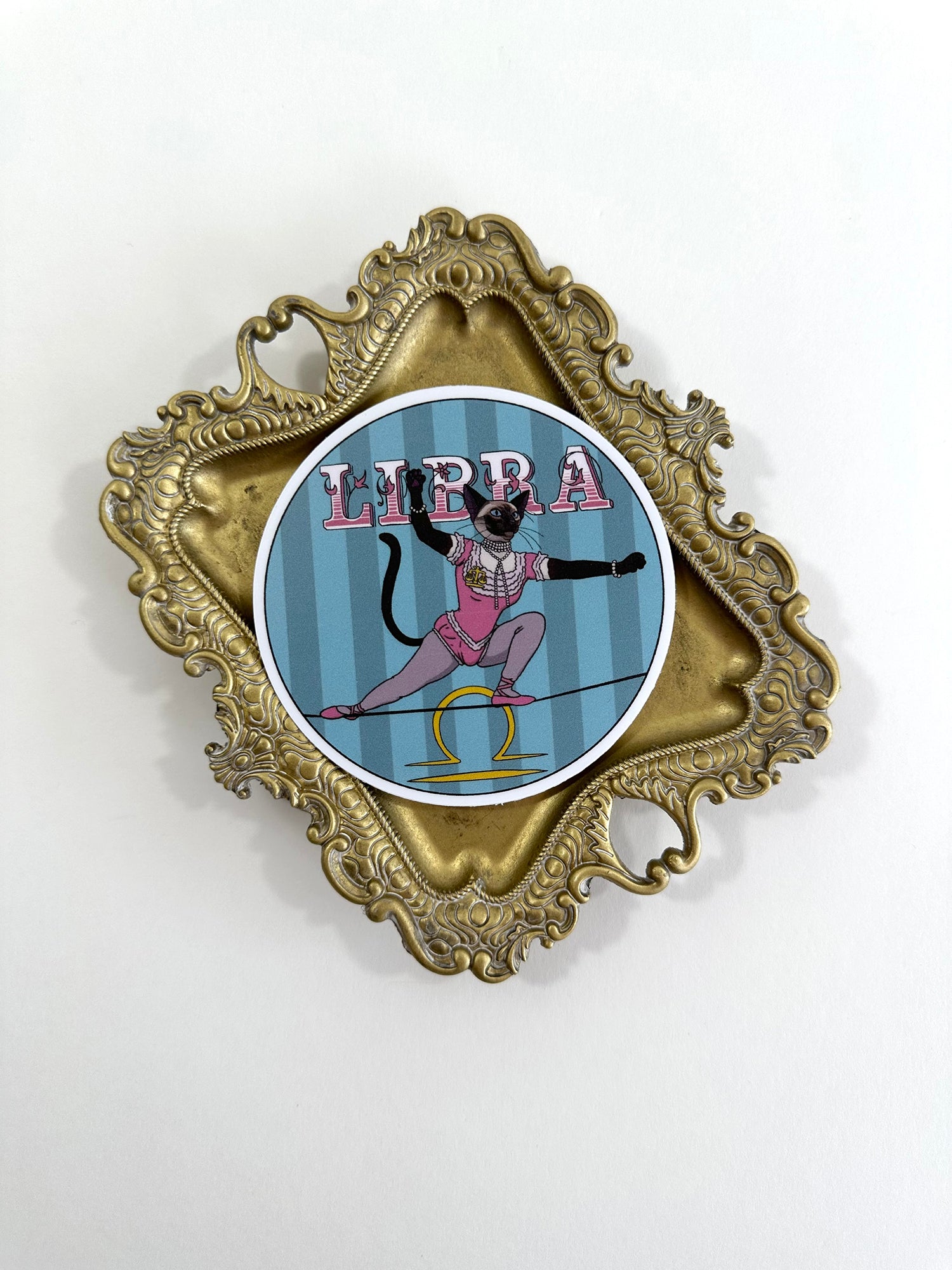 High-quality matte, vinyl, dye-cut sticker, are suitable for indoors or outdoors (cat-pun intended). They are a great addition to a water bottle, car bumper, phone case, guitar case, or any other place stickers are stuck. This design is Libra (September 23 - October 22) as an Edwardian trapeze cat.