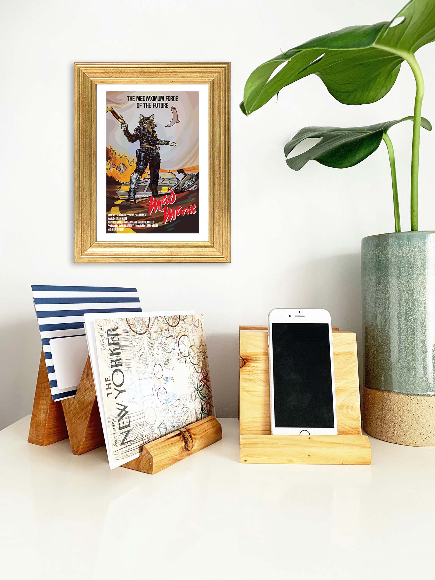 Design is "Mad Manx" with Mew Gibson. This cat themed parody of the 1979 film "Mad Max" with Mel Gibson is sure to delight any fan of cats and old movies. It has undergone catification, with every name a hilarious cat pun.