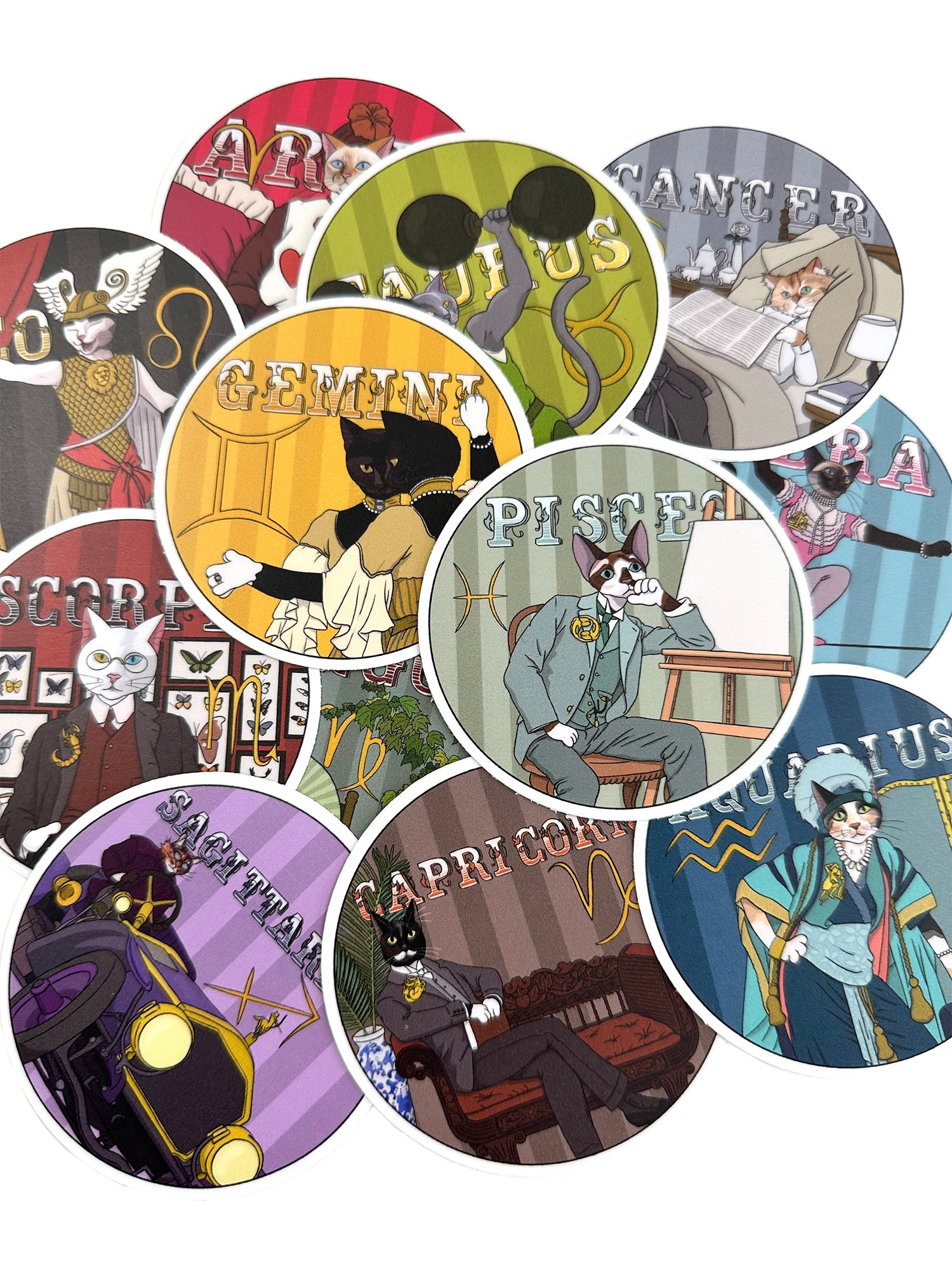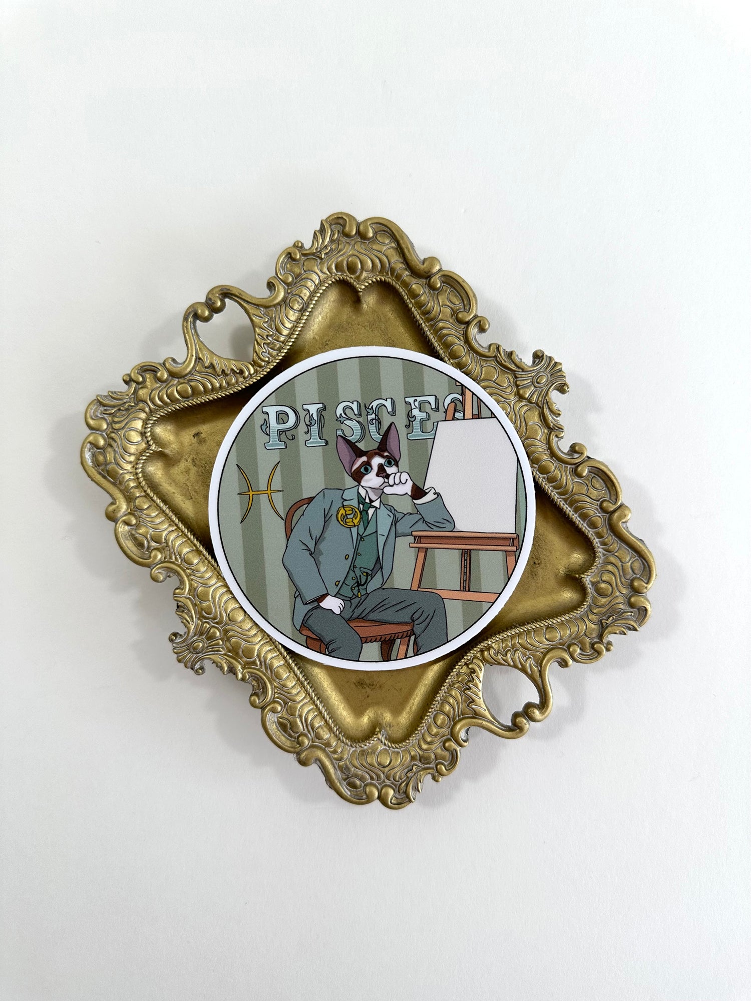 High-quality matte, vinyl, dye-cut sticker, are suitable for indoors or outdoors (cat-pun intended). They are a great addition to a water bottle, car bumper, phone case, guitar case, or any other place stickers are stuck. This design is Pisces (February 19 - March 20) as an Edwardian artist cat.